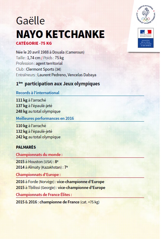 Gaëlle NAYO KETCHANKE (Clermont Sports) est championne de France 2017 avec 90kg à l’arraché et 120kg à l’épaulé jeté. En reprise après les Jeux Olympiques de Rio 2016 elle devra réaliser sa sélection pour les championnats du Monde le 28 octobre 2017 à Clermont l’Hérault à l’occasion du Tournoi international de France « Denis RANDON »